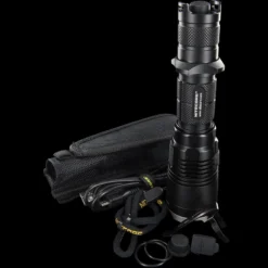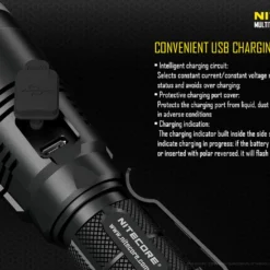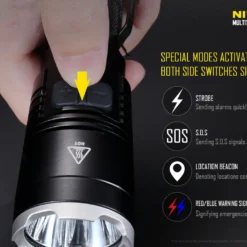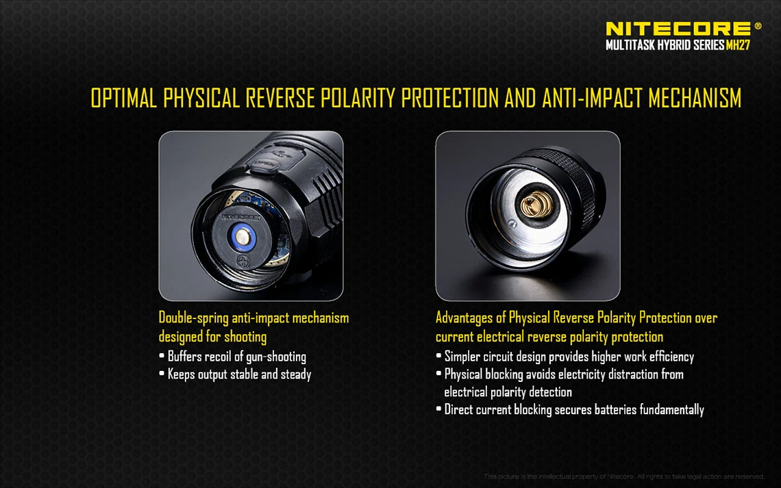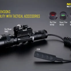 Other unique features include removable anti-rolling grip ring, reverse polarity protection (use with button top 18650 only), double spring anti-impact mechanism, which buffers recoil when mounted to a gun. The MH27 can be used in conjunction with the RSW1 remote pressure switch and GM02 gun mount. It also accepts all Nitecore 40mm filters and diffusers.