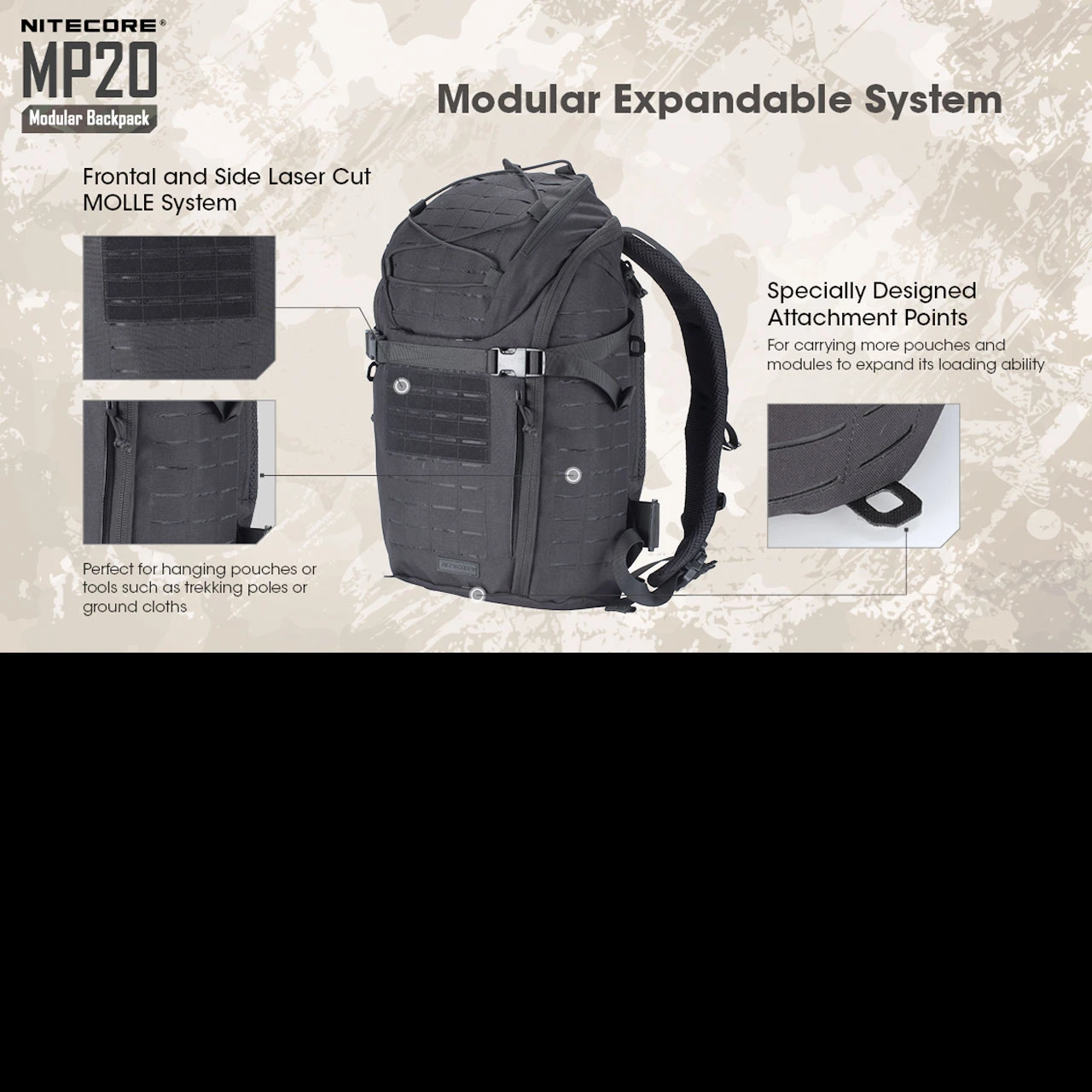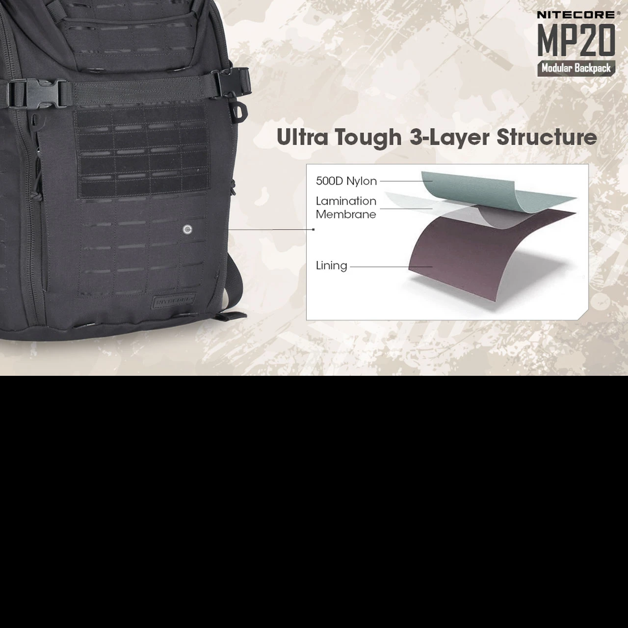 Featuring frontal and side cut Molle compatible strips, the MP20 can be added to at the various attachment points. The Nitecore NUP10 and NUP20 pouches are an ideal addition to the pack and can easily be attached to the front or side to increase storage space.