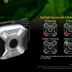 The dual light sources provide 4 lighting modes; choose from IR beam, IR flashing, green beam or green flashing. As IR light cannot be seen with the naked eye, the NU05 MI features a mode indicator on the front of the light which flashes quickly when in IR flashing mode or is on constantly if the IR beam is activated.