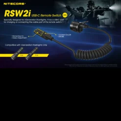 The Nitecore RSW2i remote switch is compatible with Nitecore’s i-Generation of flashlights, including the P10i, P20i and P30i. It features a USB-C port at the base for charging or connecting the cable section of the remote switch.