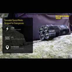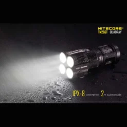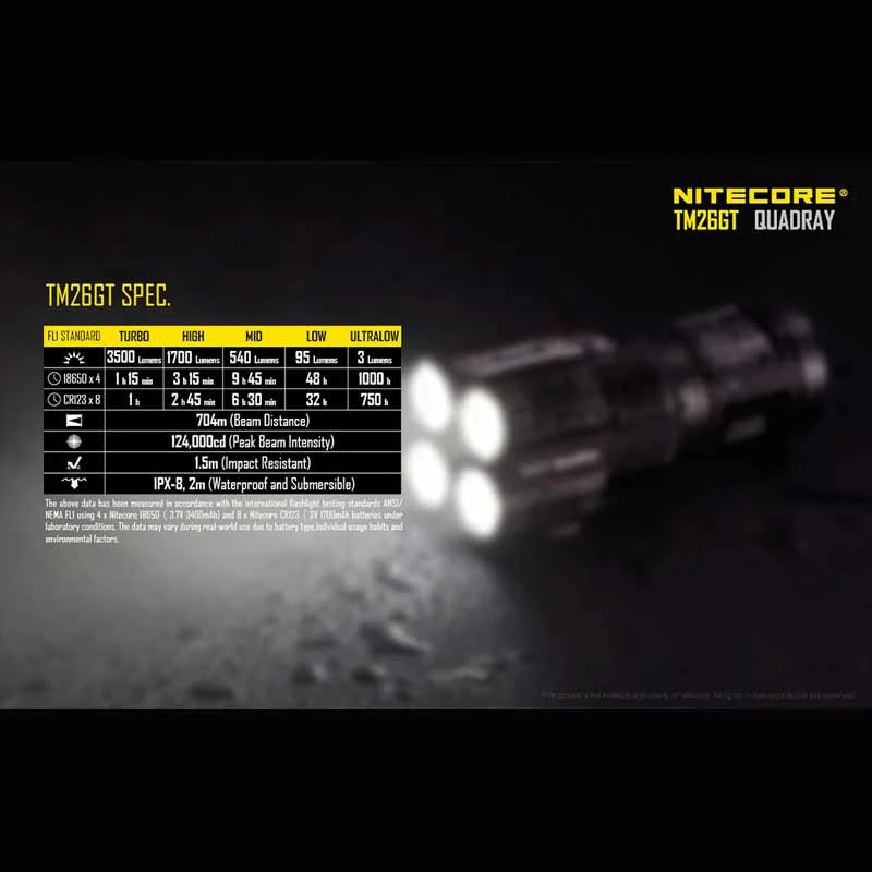 The Nitecore TM26GT has a maximum output of 3,500 lumens from the Cree XP-L HI V3 LEDs and is powered by either 4 x 18650 or 8 x CR123 batteries.