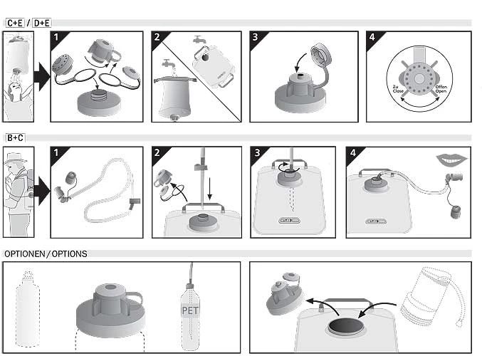 All water containers are suited for water only (max. temperature 60°C). Do not use for alcoholic, sweet or acid liquids. Do not expose drinking water too long to the heat. Change water regularly. Store dry and open. Clean inside with denture cleaning tablets. Clean outside with warm water, brush and neutral soap. Clean the valve regularly.