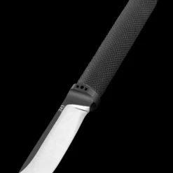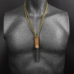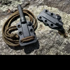 It is supplied with two sheaths, one tan coloured slim-line for around the neck and one “HD Kydex” for attachement to belt or MOLLE.