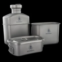Inspired by the famous canteen sets of the U.S. Military, the Pathfinder Titanium Canteen Cooking Set can be placed directly into the fire, with the cap removed. The wide mouth of the canteen makes for easy filling and pouring. A traditional set includes a canteen, cup and lid, however this set also includes a third container that can be used as a bowl, cook pan or skillet.