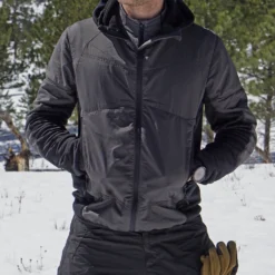 Strategic insulation in the torso, shoulders, bicep, and hood minimizes core heat loss, while a synthetic grid along the back and arms provides maximum breathability and wicking performance, even under a pack. This symbiotic combination of materials balances heat loss through convection, while strategically preventing over-heating during exertion under load.