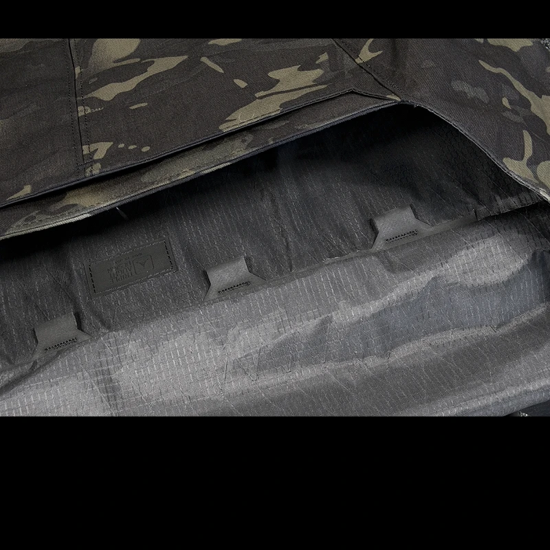 Featuring two Helix attachment points, the drop pocket is compatible with our Admin Panel 1 and forthcoming accessories. A centered welt pocket conceals 3 rows of 1” webbing, compatible with small accessories such as bike lights, folding knives, or our S1 and S2 sheaths. The padded, tubular nylon carry handle lies flat when not in use.