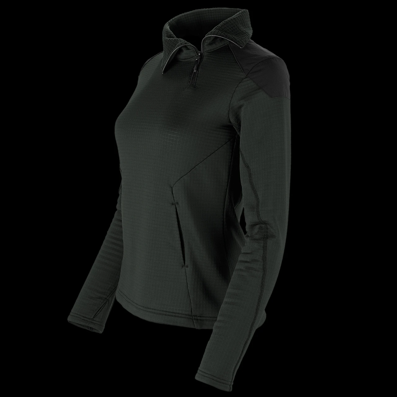 - Low-Pro Storage – A clean, on-seam kangaroo style handpocket with brushed mesh lining provides quick warmth and storage without creating hotspots or extra bulk.