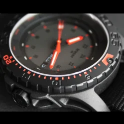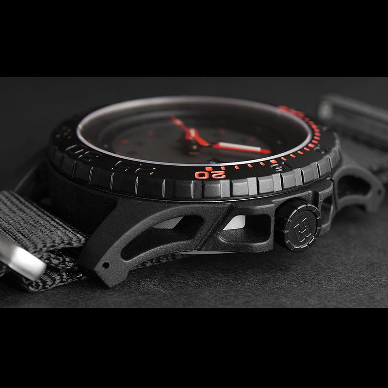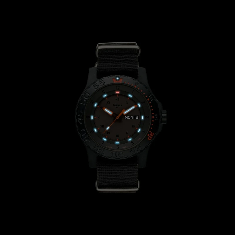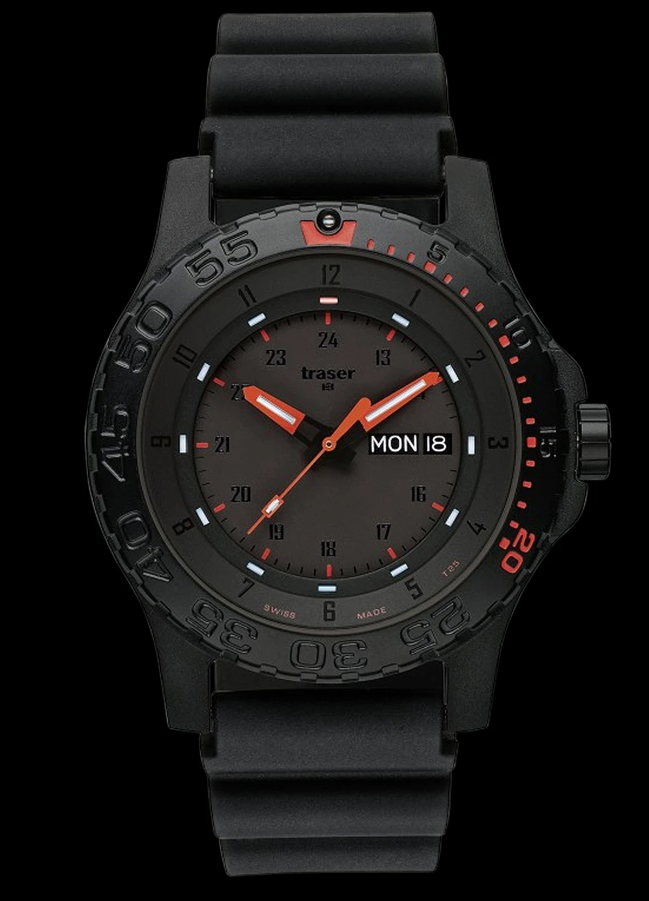 The Traser H3 Red Combat is a black wristwatch, with calendar, day-date, robust double case construction, 45 mm, bidirectional rotating black PVD-plated steel bezel, sapphire crystal and 200m water resistant.