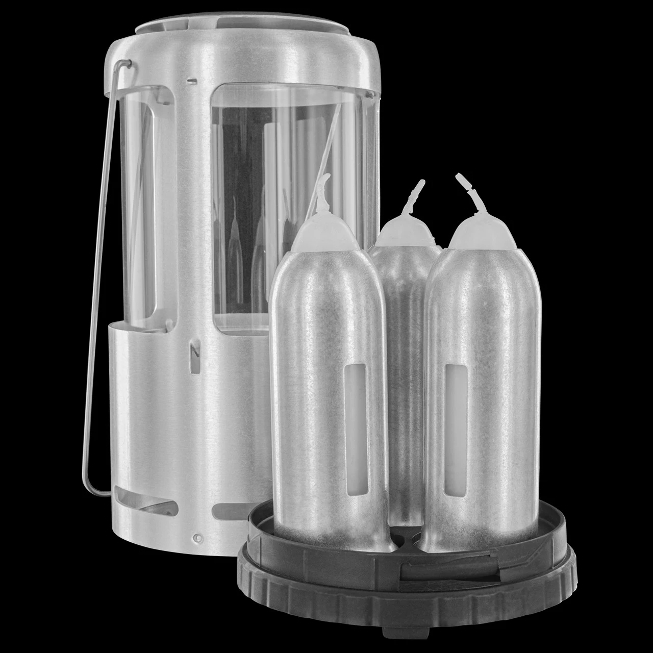 - Glass chimney and three spring-loaded candle tubes with viewing slots.