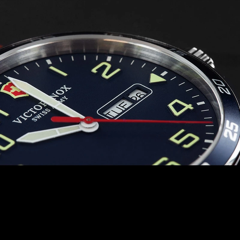 At the forefront of its field, the indispensable Victorinox Fieldforce boasts striking red second hands with a Swiss Army Knife-shaped counterweight, and a red cross and shield on the dial.