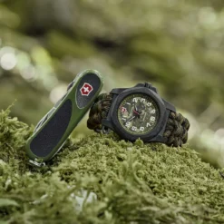 This limited edition package comes with a Victorinox Evolution 30 pocket knife, a mini Victorinox folder, a rubber bezel guard and two replacement straps.