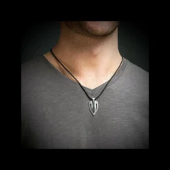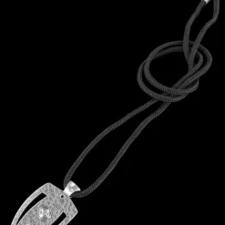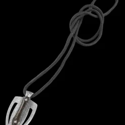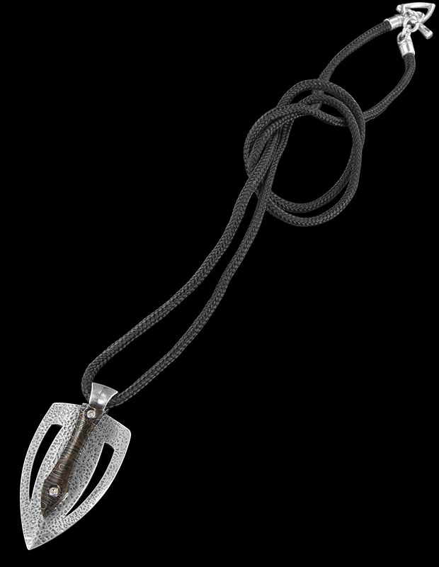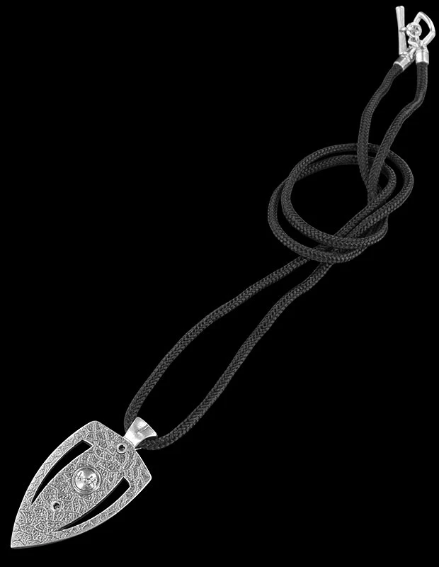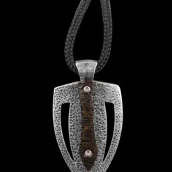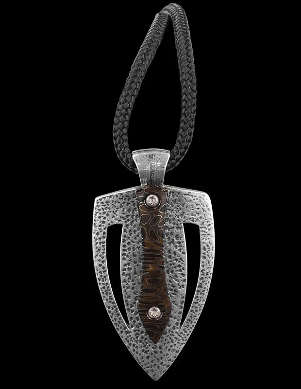 Boost the amps, turn up the bass, and let’s move! The William Henry Amp Damascus P36 really captures the essence of William Henry’s approach – sterling silver with a soft hammered finish and skeletal cutouts for intrigue, overlaid with a hand-polished accent in forged Damascus steel connected by their own micro-threaded fasteners. On paracord with a bar/toggle closure.