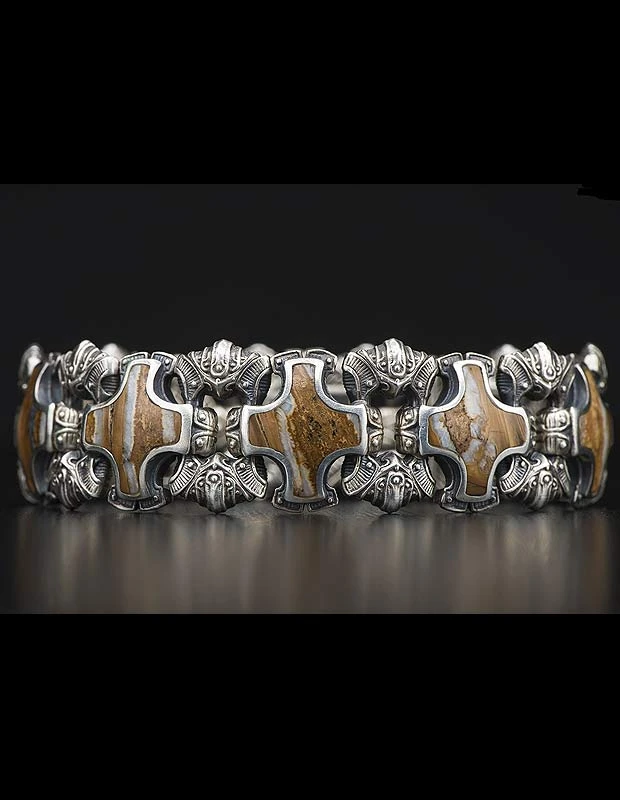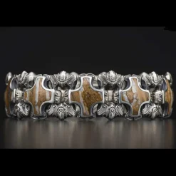 Sterling silver ‘shield’ bracelet, inlaid with a rare piece of fossil Woolly Mammoth tooth, one of the few remaining legacies of a creature that walked the earth at the dawn of civilization. Button lock clasp in stainless steel with inset diamond.